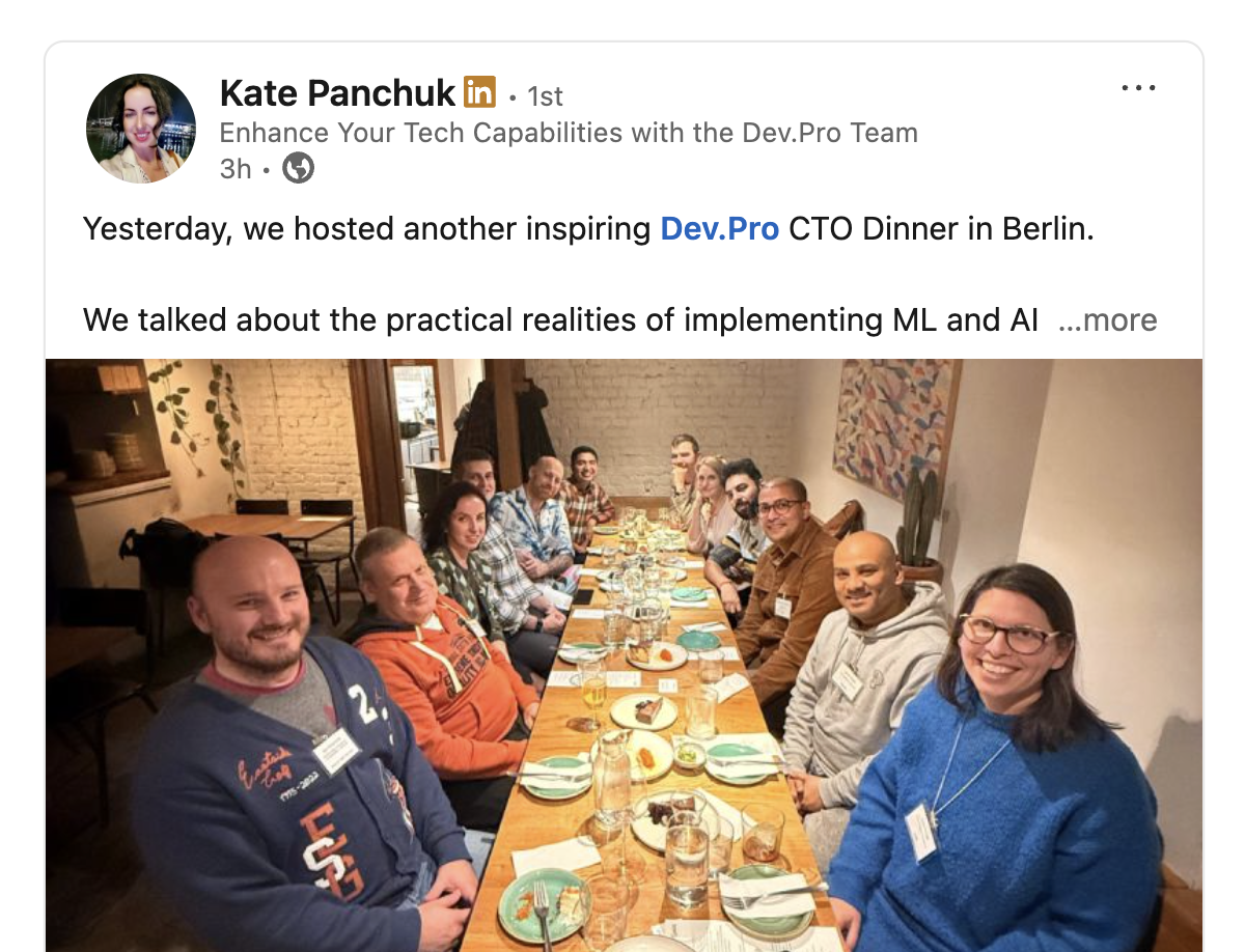 Since 2023, Dev.Pro has hosted CTO dinners to bring senior leaders in technology and product together in private dining areas of top-rated restaurants. These boutique dinners are free of charge and follow a no-selling policy to allow for optimal networking to occur. To preserve anonymity and encourage open discussion, the Chatham House Rule is used.