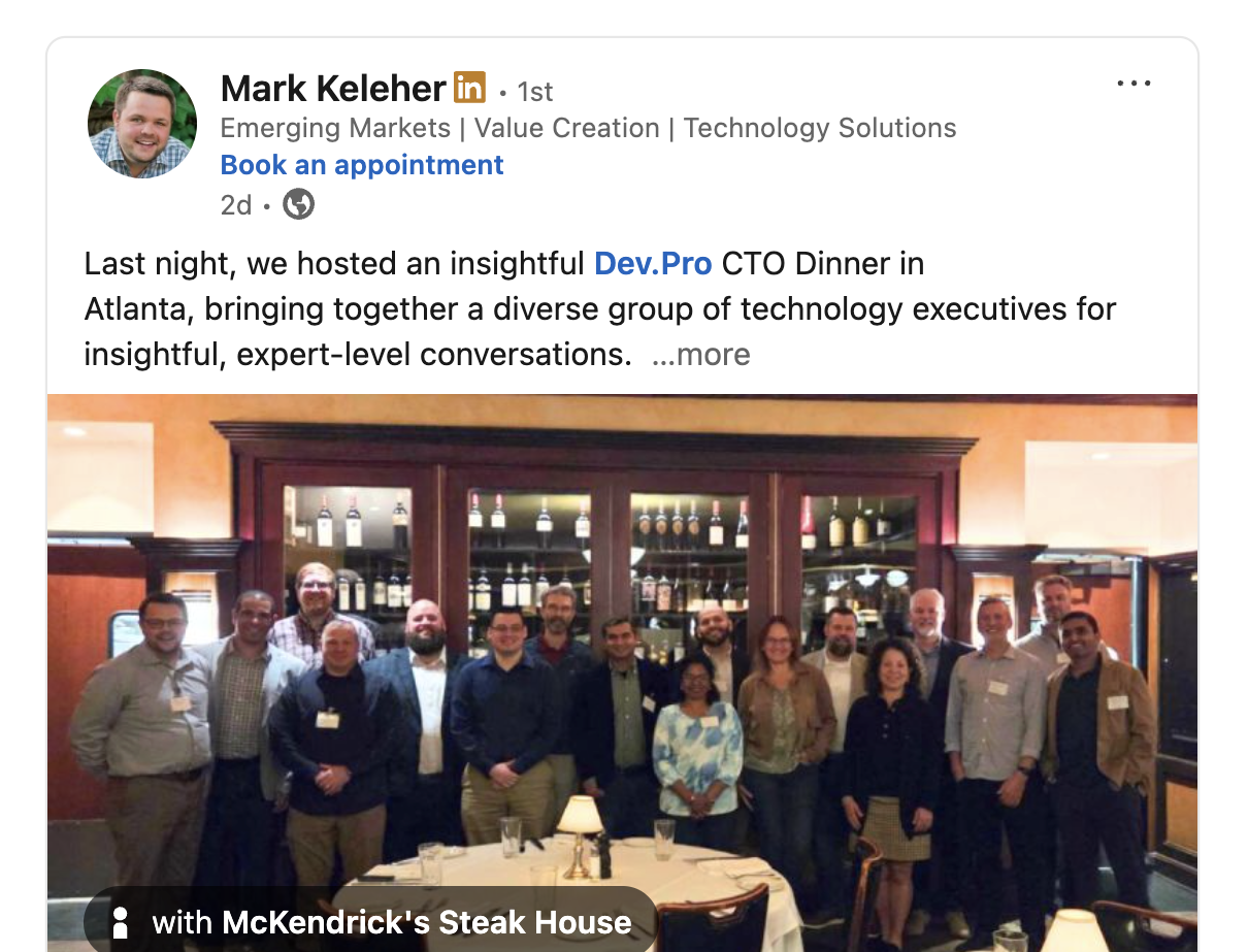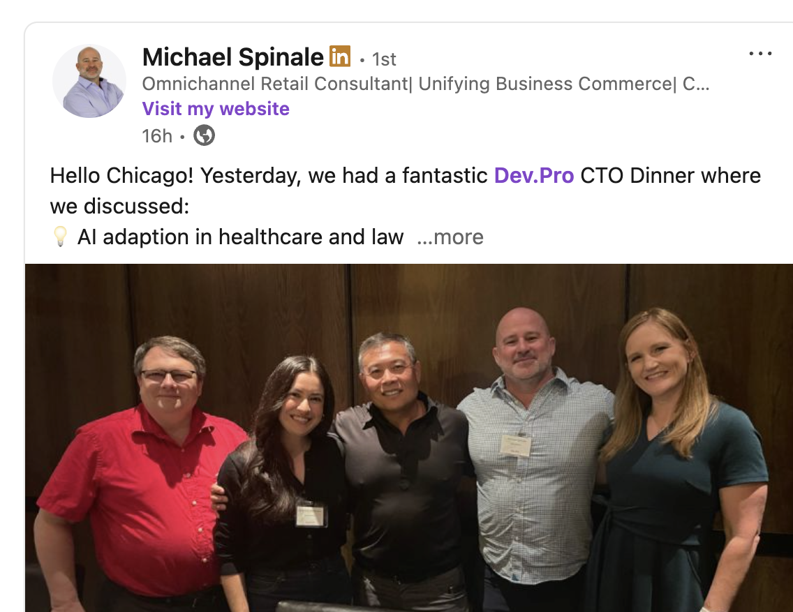 It was a pleasure to join the Dev.Pro team and technology leaders from multiple industries for a networking dinner this week. Check out information about their upcoming CTO dinners below. This team has expertise across multiple industries including restaurant technology and POS integrations.