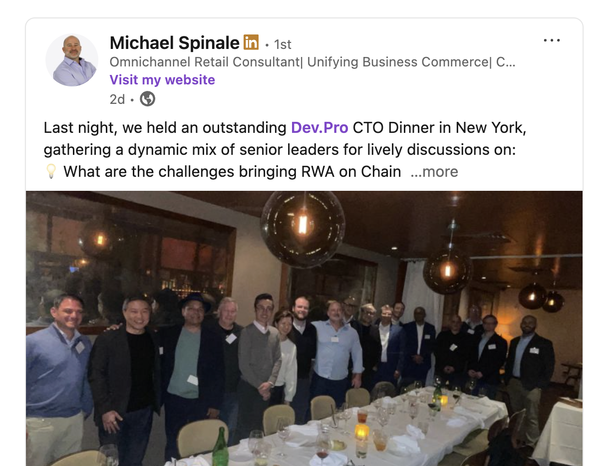 Last night's Dev.Pro CTO Dinner was truly enlightening! It was a pleasure discussing AI, remote work, and digital transformation with such a diverse and talented group. Looking forward to the next event in Denver!