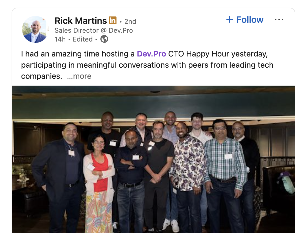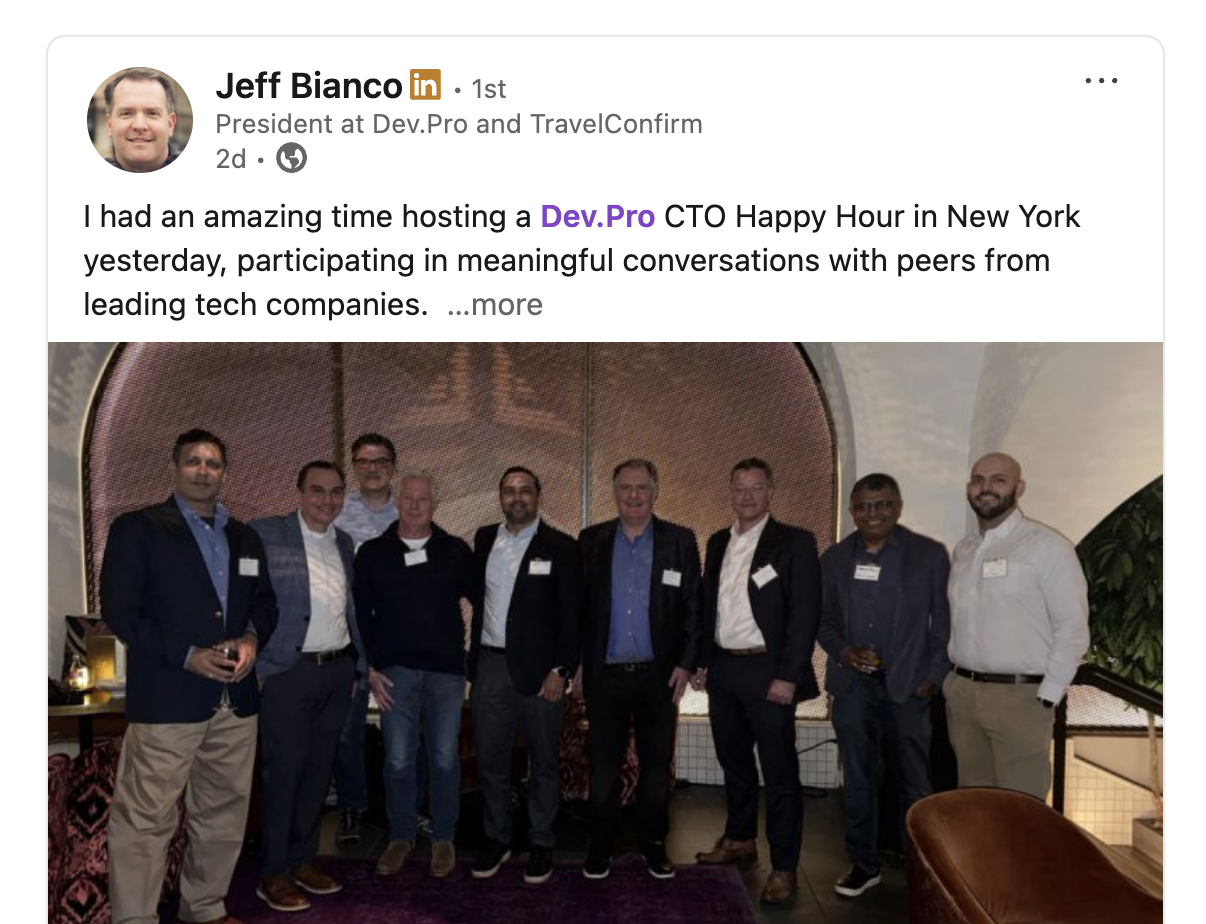 Last night's Dev.Pro CTO Dinner was truly enlightening! It was a pleasure discussing AI, remote work, and digital transformation with such a diverse and talented group. Looking forward to the next event in Denver!