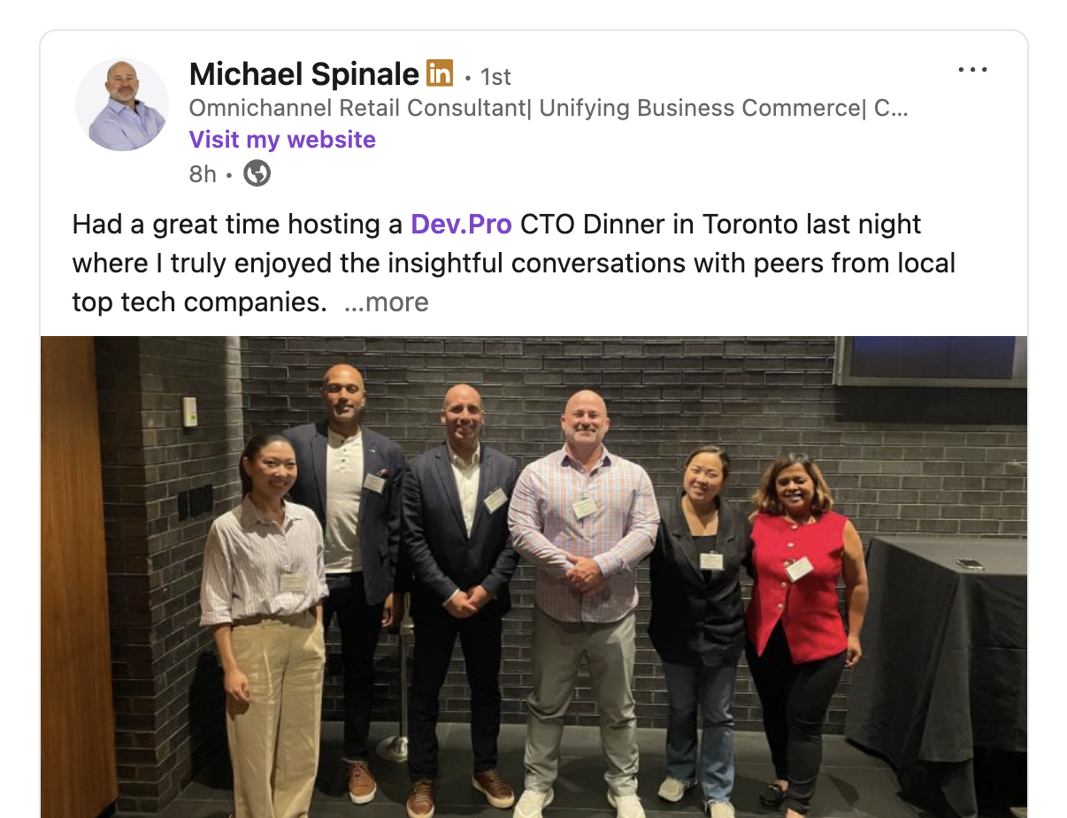 It was a pleasure to join the Dev.Pro team and technology leaders from multiple industries for a networking dinner this week. Check out information about their upcoming CTO dinners below. This team has expertise across multiple industries including restaurant technology and POS integrations.